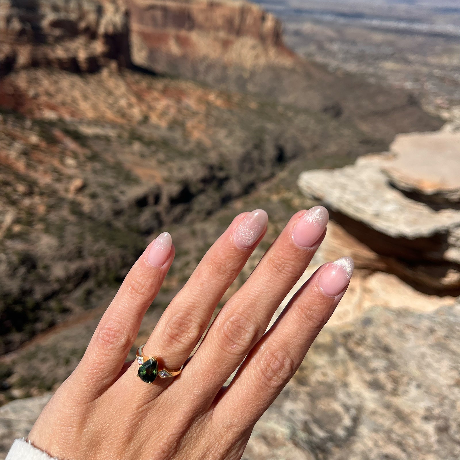 I - We have been together 7 years so I had hoped it was coming! But I had no idea he was planning it for so long, including designing the ring with Zoë. I always thought I would have an idea it was maybe coming as I know him so well, and I also thought he would be really nervous on the day so I would know. But neither of these things turned out to be true! He proposed in Colorado, where some of his family live, and it was my first day there straight off the plane. We drove to a stunning viewpoint and he asked the question. It was so perfect and special, and very very thoughtful! From the time of year (around our anniversary), to the specially designed ring, to the gorgeous location where some of his family live. He did well!